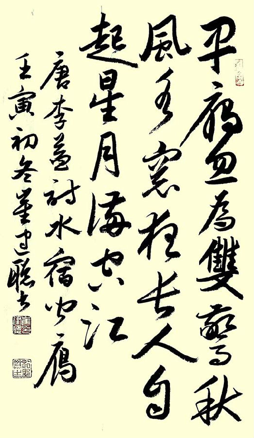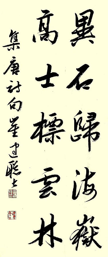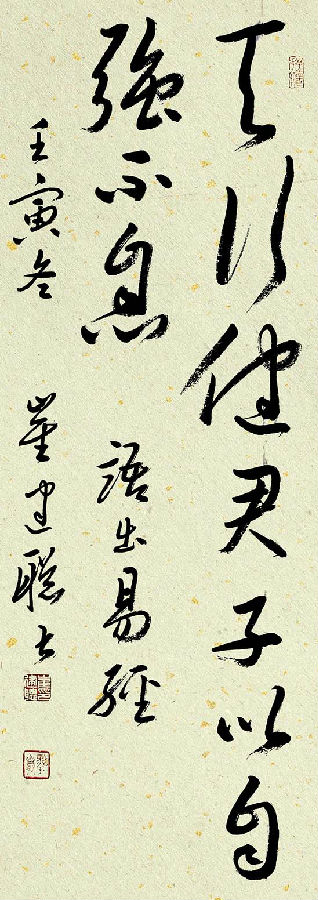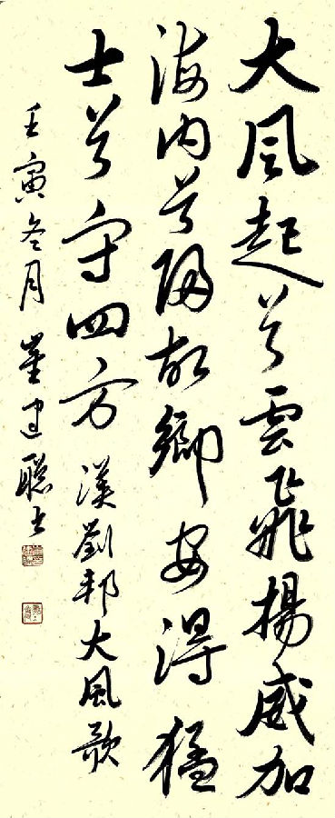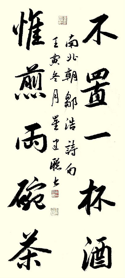 崔建聰?shù)臅?shū)法之所以別具一格,重要的原因之一就是他多年來(lái)書(shū)法與篆刻并舉,相互促進(jìn)。這種以刀代筆在方寸之間表情達(dá)意的藝術(shù)實(shí)踐,使得他的書(shū)法作品在飄逸中帶勁健,灑脫中含剛鋒。他很自然地將漢印的鐫刻技法和審美趣味運(yùn)用到具體的書(shū)法創(chuàng)作中,從而讓我們能感受到其作品在恣肆縱逸的強(qiáng)烈節(jié)奏中顯現(xiàn)出雍穆淵雅的儀態(tài)。