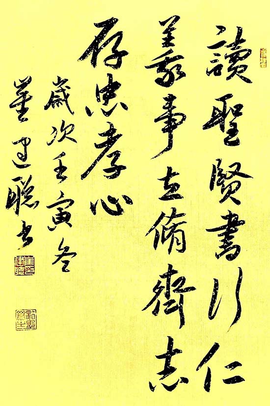 不爭(zhēng)的事實(shí),在書(shū)法藝術(shù)上有造詣?wù)弑厝粚?duì)中國(guó)古代歷史、文學(xué)和優(yōu)秀的傳統(tǒng)文化了然于心,因?yàn)闀?shū)法就是在中國(guó)古代文化的土壤中培育出來(lái)的一朵奇葩,學(xué)書(shū)者如果不能自覺(jué)擺脫淫于技、滯于巧的歧途而飽讀詩(shī)書(shū)是斷然成不了氣候的。我們看歷史上的一代書(shū)家,無(wú)一不對(duì)琴棋書(shū)畫(huà)樣樣皆精,詩(shī)詞曲賦般般都曉。尤其是文學(xué),書(shū)法時(shí)常受到文學(xué)思潮的影響,書(shū)法家在選擇與自己心性相契合的詩(shī)文時(shí),往往把內(nèi)在的情感外化到“有意味”的線條符號(hào)中,從而實(shí)現(xiàn)“物我神游”的大化之境。崔建聰深得其道,他數(shù)十年如一日將自己沉浸于中國(guó)博大精深的文化典籍中,為自己書(shū)藝精進(jìn)蓄積了雄厚的力量。他在用毛筆書(shū)寫(xiě)蘊(yùn)藏于心的微言大義的名言警句的時(shí)候,其實(shí)就是在筆走龍蛇的過(guò)程中體悟人生、涵養(yǎng)精神。有評(píng)論家說(shuō):“作為一名優(yōu)秀的出版人,他不斷汲取古今中外文學(xué)、史學(xué)、哲學(xué)、美學(xué)中的精髓來(lái)滋養(yǎng)其書(shū)法實(shí)踐。臨摹碑帖與誦讀詩(shī)書(shū)并舉,持存守正與開(kāi)拓創(chuàng)新共進(jìn),從而呈現(xiàn)出“以學(xué)養(yǎng)書(shū),以書(shū)修德”的書(shū)法自覺(jué)。”