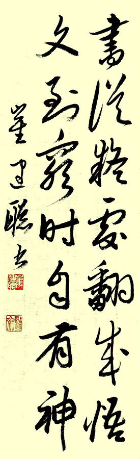 從整體上來(lái)看,崔建聰?shù)臅?shū)法運(yùn)筆流暢、筆力清健,點(diǎn)畫(huà)有致,格調(diào)典雅。不管是條屏斗方,還是扇面長(zhǎng)卷都泛漾著深邃高華之風(fēng)韻和濃厚的書(shū)卷氣息,充斥著氣貫神完的感人力量。就單個(gè)字而言,看似隨意率性,實(shí)則持法有度,細(xì)細(xì)品鑒每一個(gè)字,往往給人一種新奇的美感和逸筆草草的灑脫。