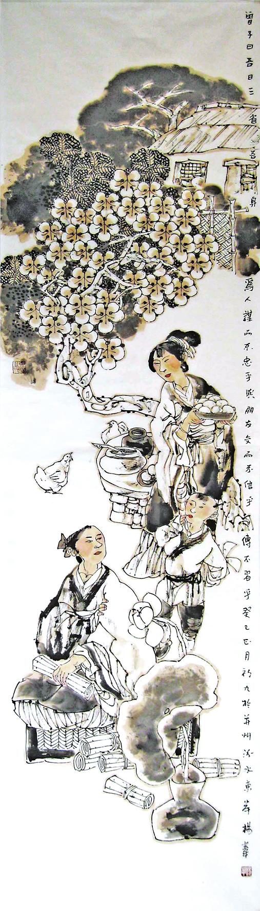 楊葦的人物畫作品,由于沿襲了深厚的連環畫功底,線條細膩超逸,畫風清峻通脫、詩意盈然,他的中國畫作品迅速受到了業界的關注。如今,在我們周圍許多地方都可以見到他的作品:侯馬新田廣場、寶鼎公園的重大歷史片斷畫面;臨汾濱河公園九州廣場、廉政廣場的文化墻,古城公園的歷史名人畫像……都是他的作品。此外,臨汾、侯馬許多外事活動中,他的作品如《三晉一百名人圖》等常常被作為貴重禮物贈送給來賓們。別看楊葦年齡不大,但其實已是一位著作等身的畫家,量的積累已經讓他的創作達到了隨心所欲的境界。