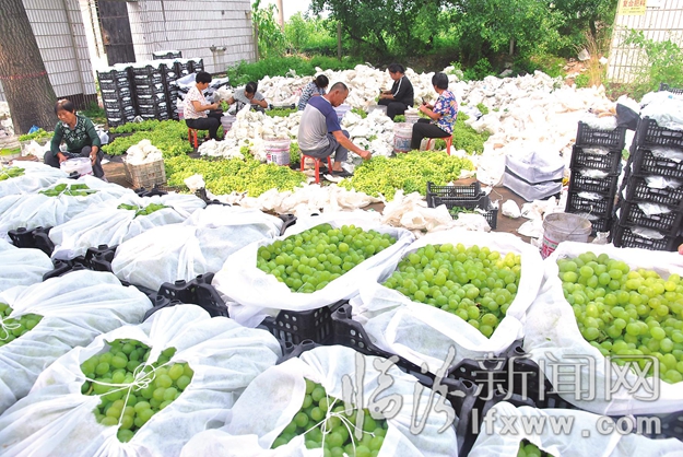 臨汾新聞網訊 今年曲沃縣里村鎮萬畝青提、紅提葡萄迎來大豐收。在里村的道路兩旁,隨處可見忙碌的農戶將葡萄剪摘、裝箱、裝車、送貨,農民們雖然汗流浹背,但臉上依然掛滿了幸福的笑容。圖為里村村民柴福根近日組織人員剪摘葡萄裝箱。