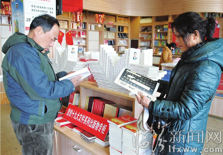 臨汾新聞網訊 近日,在曲沃縣新華書店內,市民在黨的十九大文件系列出版物專柜閱讀、選購圖書。春節期間,曲沃縣新華書店成為市民閱讀充電、親子學習的好去處,在陣陣書香中,人們選擇用閱讀度過一個頗有文化味兒的節日。