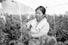 農民在泰瑞農牧林場大棚里管理蔬菜。該林場是呂梁市泰化集團在康家嶺村流轉、租賃周邊土地、荒地開發建設的,為當地農民增收開辟了新渠道。