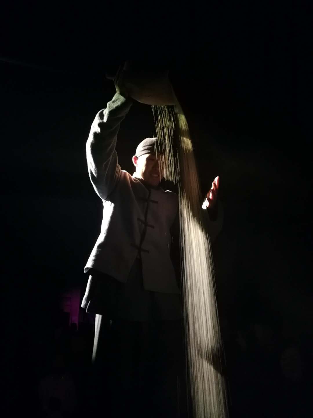 演出第一幕發生在中道莊石牌坊,陳昌期八十歲生辰那年,天災不斷,本想買糧賑災,但四子陳廷愫帶領的人馬卻遭遇水患,糧、錢兩空。此時此刻,大批災民就在城外。生死交困之間,陳昌期選擇放糧賑災!這是一個離我們較遠的時代記憶,但當我們看到那一個個起身的饑民,才明白此人間大愛。