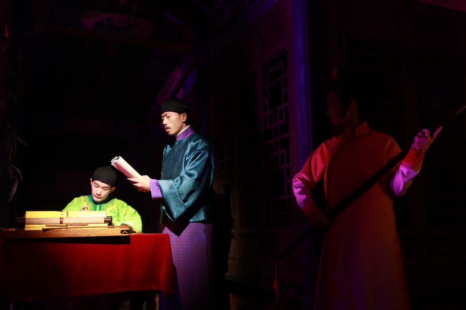 第三幕帶記者朋友們進入相府內院中,陳廷敬的妻子王氏在家孝敬公婆,與陳廷敬相隔千里、多年未見。她獲封一品誥命的圣旨傳來之時,陳廷敬也聘請京城最好的畫師,為妻子畫一幅肖像、帶回京城。接旨前,王氏回憶起自己嫁進陳家的那一天,情深意切,淚灑現場。