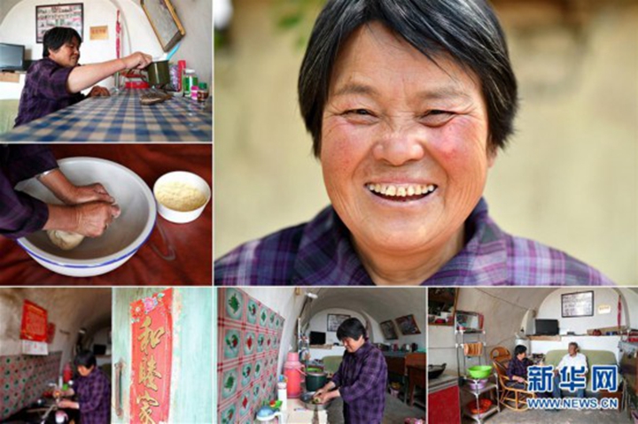 左中:王秀英在和面;左下:王秀英在做午飯;