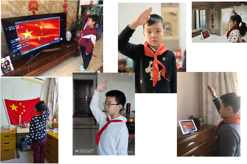 網絡課堂的另一邊,雖然身處不同環境中,同學們都認真佩戴好紅領巾,面向國旗鄭重敬禮。