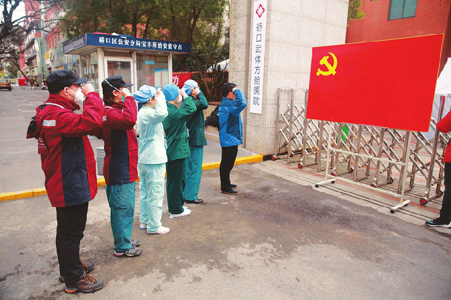 本報武漢電(記者晉帥妮)2月29日下午5時,武漢市硚口武體方艙醫院,“我志愿加入中國共產黨,擁護黨的綱領,遵守黨的章程,履行黨員義務,執行黨的決定,嚴守黨的紀律,保守黨的秘密……”奮戰在抗擊疫情一線的入黨積極分子——我省醫療隊隊員王蔚、薛文龍、趙彩霞等5人與湖北省第三人民醫院醫務人員韓丹青,面向黨旗莊嚴宣誓。