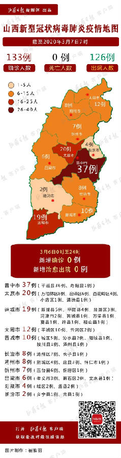 截至3月6日24時,山西省11個市累計報告新型冠狀病毒感染的肺炎確診病例133例。其中: