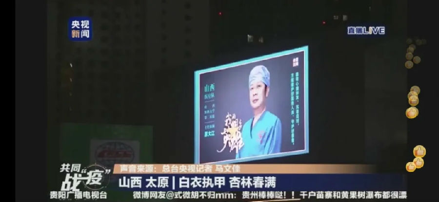 “央視新聞報道了山西醫療隊,我們看到了滾動閃爍的巨幅照片,為這些白衣天使們點贊!”3月18日,不少太原市民發現,在大南門、五一廣場、萬象城等地的戶外電子屏上,滾動播放著9張山西醫護人員的照片。他們都是支援武漢一線的醫護人員,也是我們的同鄉“山西醫生”。