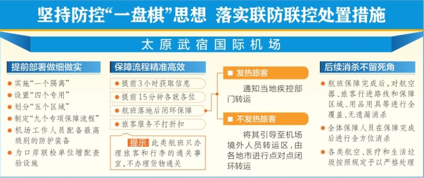 防境外疫情輸入的任務復雜、艱巨而重要,山西航產(chǎn)集團所轄的太原武宿國際機場按照省委、省政府和民航局疫情防控工作要求,迅速行動,在指揮部的統(tǒng)一指揮下,堅持防控“一盤棋”思想,與其他部門及相關航空公司,建立聯(lián)防聯(lián)控機制,落實聯(lián)防聯(lián)控處置措施。
