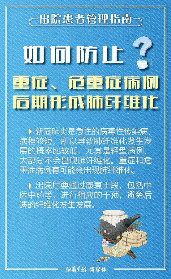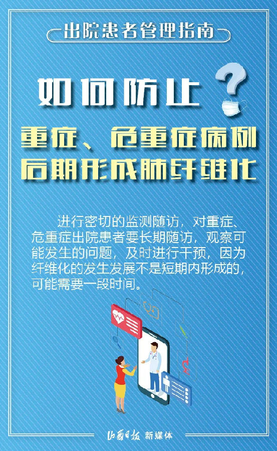 出院患者需要注意什么?處于恢復(fù)期但有基礎(chǔ)疾病的新冠肺炎患者如何管理?如何防止重癥、危重癥病例后期形成肺纖維化?一組海報(bào)講清楚。
