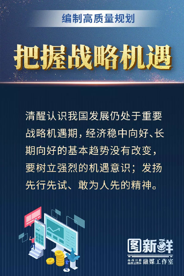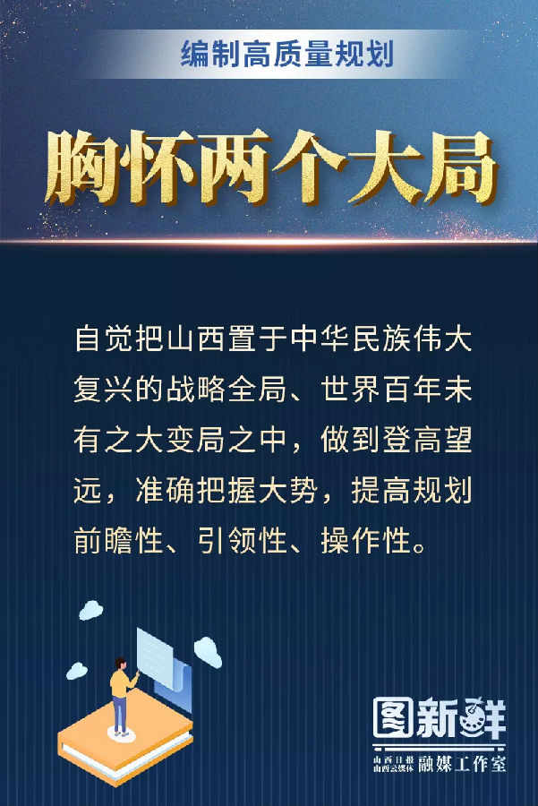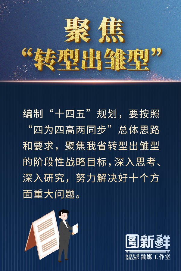 樓陽生強調,要以習近平新時代中國特色社會主義思想為指引,深入學習貫徹“三篇光輝文獻”,貫徹落實“四為四高兩同步”總體思路和要求,胸懷大局,把握機遇,圍繞“轉型出雛型”,努力編制一個高質量規(guī)劃,為譜寫中國特色社會主義現代化建設山西篇章描繪藍圖、凝聚力量。
