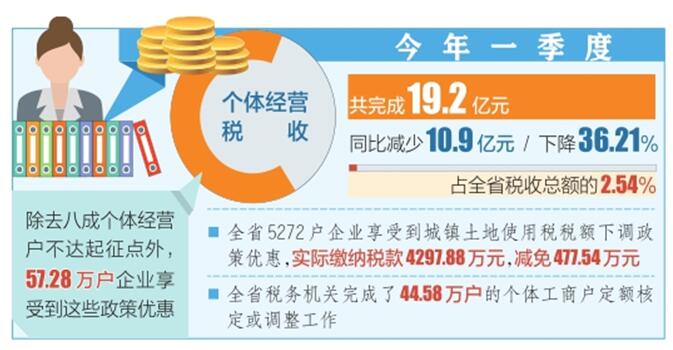 個體經營戶是維系社會運轉的“毛細血管”,是重要的就業主體。截至2019年底,我省共有個體經營登記戶數57.28萬戶,占全部登記戶數的48.25%。其中個體經營繳稅戶13.14萬戶,僅占個體經營登記戶數的22.94%,近八成的個體經營戶不達起征點,在2019年實施更大規模減稅降費政策下,共減稅93.73億元。數據顯示,我省個體經營戶享受減免戶數多,減免稅額大,實際繳稅少。