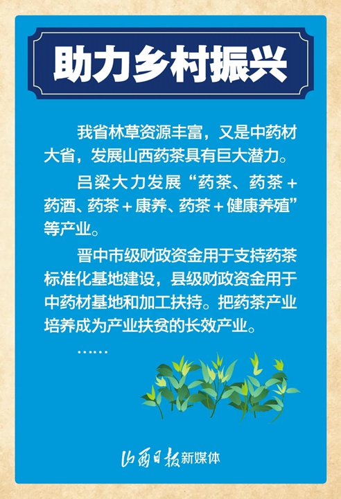 當前,山西藥茶成為實施鄉村振興戰略和脫貧攻堅的新支撐、成為農業轉型發展的新亮點、成為高質量發展和高品質生活的新載體。