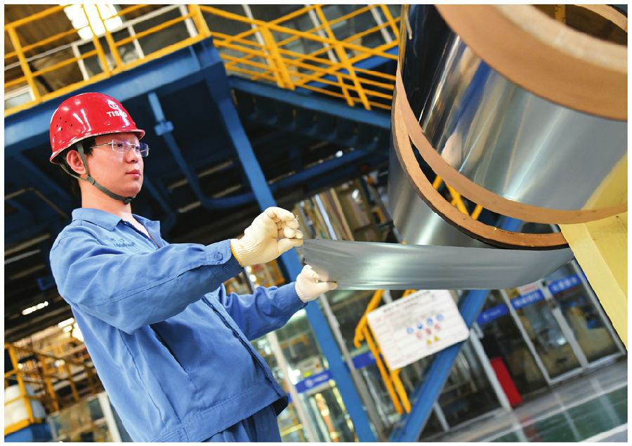 山西堅定貫徹落實習近平總書記關于創新驅動、科教興國、人才強國的重大戰略思想,手撕鋼、碳纖維、碳化硅等技術創新取得重大突破。圖為太鋼集團生產車間正生產手撕鋼。該公司2018年研發的寬幅精密帶鋼箔材(厚度0.02毫米,寬640毫米)成為世界首創,因其厚度不到頭發直徑的1/3、比A4紙還要薄、可以用手輕易撕開,被形象地稱為“手撕鋼”。 山西省委宣傳部供圖