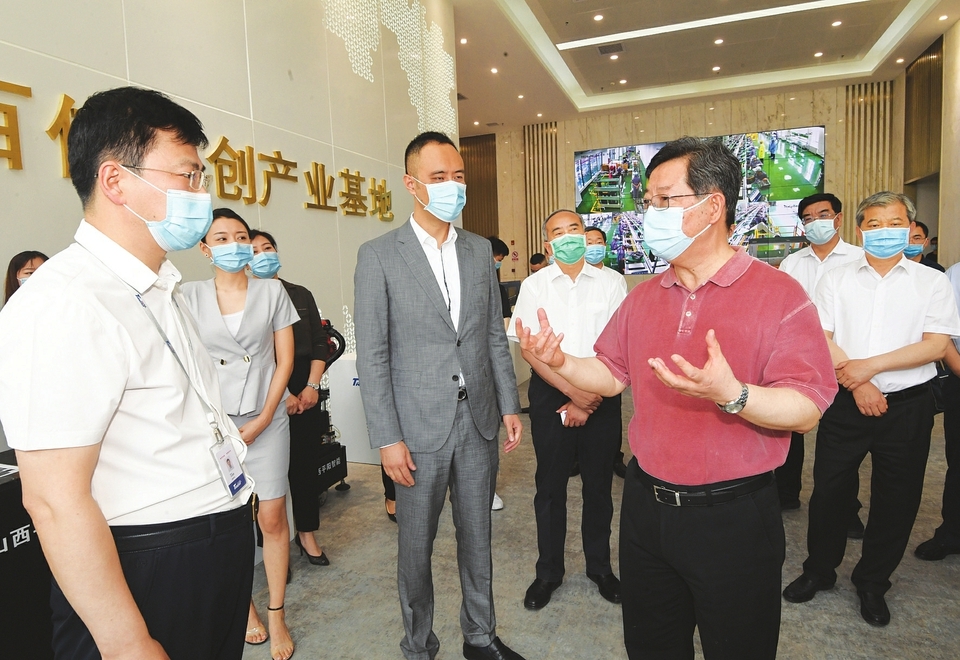 六月六日,在綜改示范區某新一代信息技術研發產業基地投產現場,省委書記樓陽生與項目及合作企業負責人深入交流。山西日報記者李聯軍攝