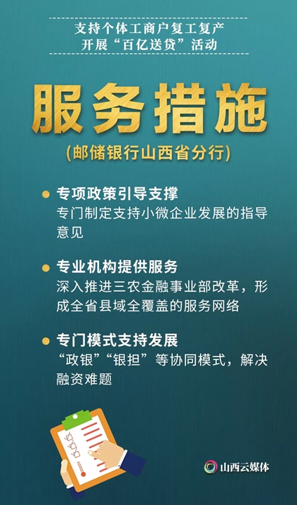 6月9日,省政府新聞辦舉行新聞發布會介紹,山西省市場監督管理局、中國郵政儲蓄銀行山西省分行聯合開展的“百億送貸”活動正式啟動。活動致力于解決小微企業和個體工商戶貸款難、渠道窄、門檻高、成本大的問題,力爭使至少20萬戶小微企業和個體工商戶受益。