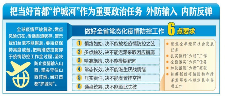 樓陽生對做好全省常態化疫情防控工作提出六點要求:一是慎終如始,決不能放松疫情防控之弦。在常態化疫情防控條件下,一旦放松警惕,就有可能產生疫情新燃點。各級黨委和政府、各有關部門特別是主要負責同志要始終把疫情防控作為重要任務,擺在重要議事日程,抓緊抓實抓細常態化疫情防控各項舉措,持續鞏固來之不易的防控成果,決不能前功盡棄、功虧一簣。二是多點觸發,決不能遲滯采取因應措施。抓好防控、兵貴神速。要始終保持靈敏反應的監測預警,一旦有情況,當機立斷,立即采取措施。要發揚前期防控工作“百分之百”的精神,充分運用現代信息技術手段,動態摸排識別重點人員,全部納入閉環管理,堅決防止漏管失控。要建立健全多點觸發、靈敏高效的反應機制,明確每個觸點的部門責任,防止因貽誤戰機導致疫情反彈。三是精準施策,決不能模糊靶向。落實“面上放開、點上精準、關口內置、閉環管理”工作策略,找準靶點,對癥施策,加強全省農貿市場、海鮮市場等重點場所全面排查和定期、不定期抽檢工作,加強生鮮產品冷鏈流通環節的管理監測,加強郵件等物品消殺工作,進一步提高防控工作的針對性有效性。四是常態長效,決不能滋生厭戰情緒。上面松一寸,下面松一尺。各級各部門特別是主要負責同志要始終保持定力耐力,做好長期作戰的思想準備、工作準備,對防控漏洞再排查、對防控重點再加固、對防控要求再落實,織密織牢疫情防控網,做到一天不勝、一刻不松,一抓到底直至全勝。五是壓實責任,決不能虛置掛空擋。嚴格落實機關部門、企事業單位、社團機構等所有法人單位及農村社區防控責任,強化公民義務責任,打好疫情防控人民戰爭。要抓好各級各類學校疫情防控工作,住校的嚴格封閉管理,走讀的“兩點一線”閉環管理,落實學校、家長、學生“三位一體”防控責任。要引導廣大群眾自覺不聚集,堅持疫情防控中養成的戴口罩、勤洗手、常通風良好衛生習慣,抓好《山西省禁止公共場所隨地吐痰的規定》的執行落實,化風成俗,培育健康生活方式。六是通盤統籌,決不能顧此失彼。聚焦全年經濟社會發展任務,扎實做好“六穩”工作,全面落實“六保”任務,加快推進“六新”突破,統籌抓好疫情防控和改革發展安全穩定民生各項工作。要落實好“項目為王”要求,省市縣各級要持續推進項目投產一批、開工一批、簽約一批“三個一批”活動,讓更多好項目、大項目、新項目落地、建成、達效。各開發區要通過曬項目、亮數據、比成績、找差距,進一步在全省形成大抓項目的濃厚氛圍。要緊盯開發區督察中發現的問題,狠抓整改落實,強化規劃引領管控,把明確“四至”范圍、實現“多規合一”等基礎性工作落實到位,發揮好開發區主戰場、主陣地、主引擎作用,助推高質量轉型發展。