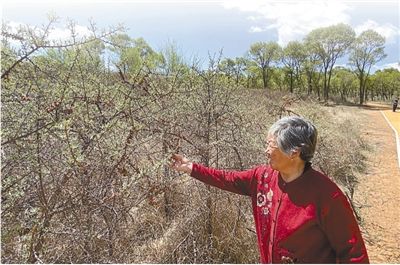 王明花在黃沙洼的“小老楊”和沙棘林間進行日常管護。記者 喬 棟攝