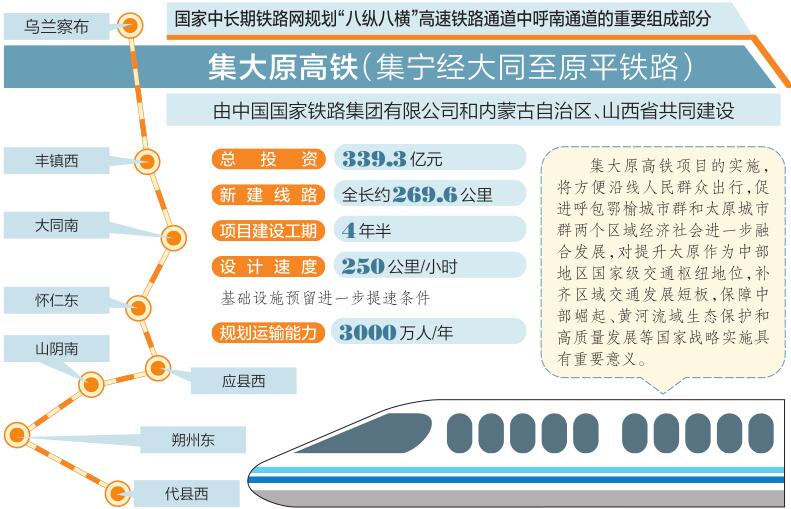 集大原高鐵是國家中長期鐵路網規劃“八縱八橫”高鐵網呼南通道的重要組成部分。項目由中國國家鐵路集團有限公司和內蒙古自治區、山西省共同建設,總投資339.3億元,建設工期4.5年。項目北接內蒙古自治區烏蘭察布市,途經我省大同市、朔州市,南連忻州市并經由大西客專與太原市貫通,設烏蘭察布、豐鎮西、大同南、懷仁東、應縣西、山陰南、朔州東和代縣西8座車站。項目建成后,呼和浩特至太原、大同至太原乘車時間將分別縮短為150分鐘、76分鐘。