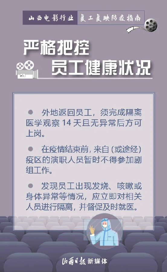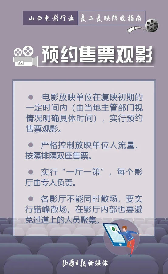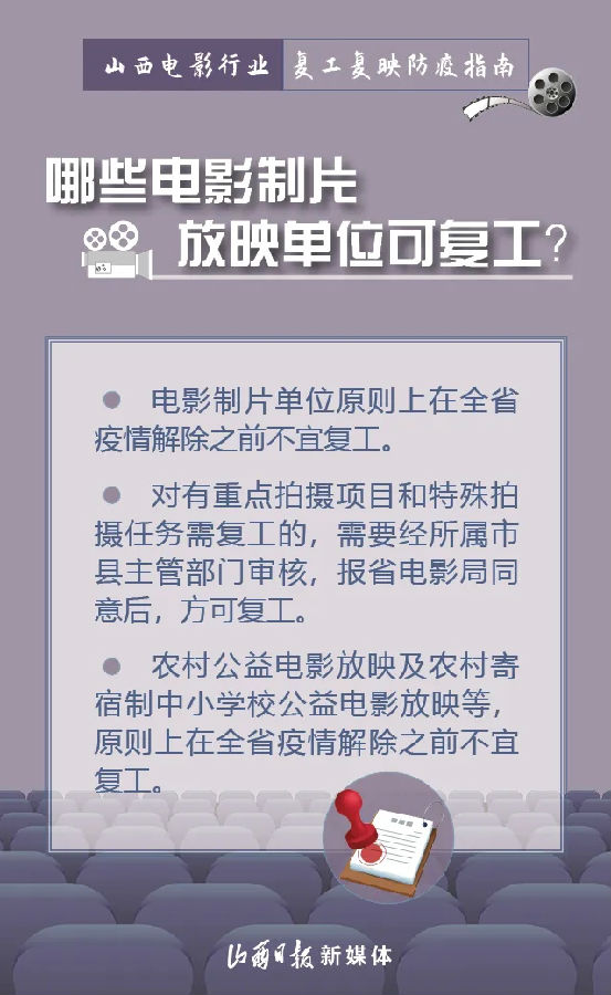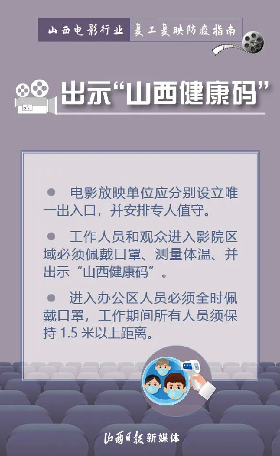 電影院放映場所是空間封閉、人員聚集和流動量大的場所,疫情風(fēng)險較高。為了更好統(tǒng)籌抓好疫情防控和推動我省電影業(yè)有序復(fù)工復(fù)映,山西發(fā)布《新冠肺炎防控期間山西省電影行業(yè)復(fù)工復(fù)映防疫指南》,對全省電影行業(yè)復(fù)工復(fù)映防疫工作提出指引。