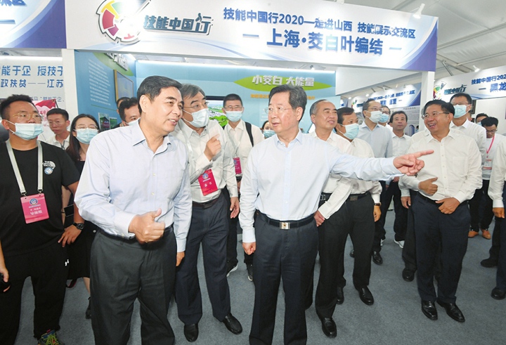 八月十一日,全國扶貧職業技能大賽在大同開幕。開幕式后,人社部黨組書記、部長張紀南,省委書記樓陽生,省委副書記、省長林武與嘉賓一同參觀職業技能培訓成果展。記者李聯軍攝