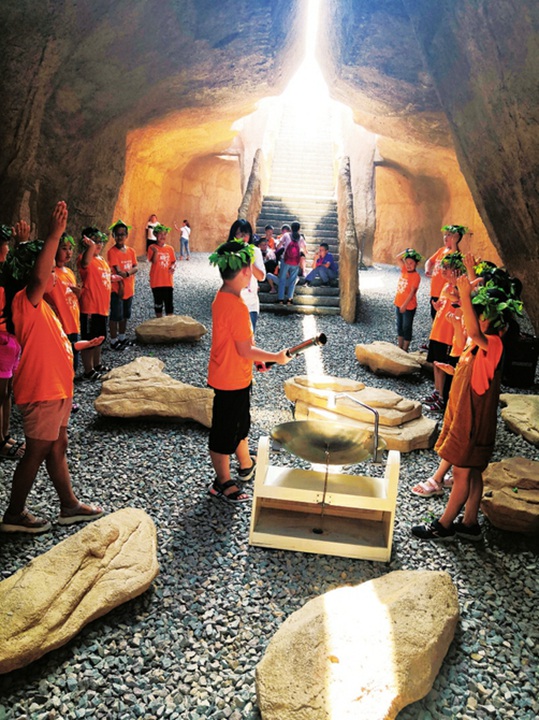 參觀完展廳,拾階而上,沿途雕塑處處活靈活現(xiàn)地展示西侯度人取河水飲用之便利,擇黃土洞穴而群居,結(jié)伴在山林和水澤呼嘯圍獵,用打制過的石器切割獸皮,將獸肉或投于火堆或架于火堆之上燒烤,取熟食大快朵頤等場景。游客一路走,一路傾聽導(dǎo)游講解,一個個人類進化史的知識點,一個個彰顯人類遠古文化的故事,將深深地銘刻在記憶中。