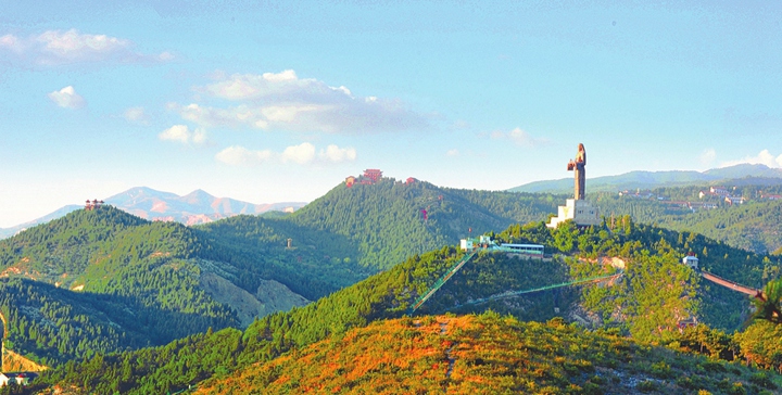 8月的一場大雨過后,湛藍的天空上飄著朵朵白云。老頂山青山疊嶂,山頂數十米高的炎帝像在陽光的照耀下,閃耀著金色的光芒。