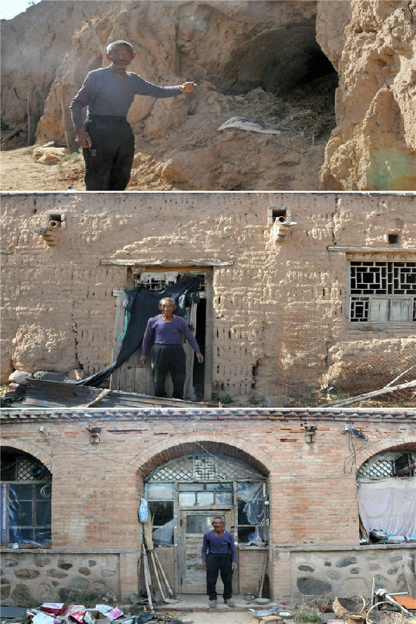 這是一張拼版照片。上圖為米薪關(guān)鎮(zhèn)石羊莊村村民袁生站在曾經(jīng)住過的土窯洞前;中圖為袁生站在曾經(jīng)住過的土坯房前;下圖為袁生站在曾經(jīng)住過的破磚房前(6月3日)。新華社記者 晏國政 攝