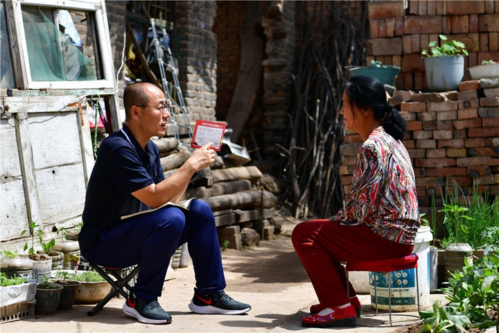 山西省嵐縣井峪堡村第一書記劉志軍在走訪村里的脫貧戶(6月10日攝)。新華社記者 曹陽 攝