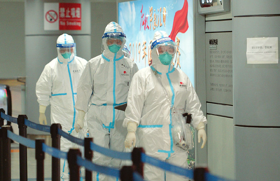 8月22日,太原海關工作人員身著防護服準備開展入境國際航班衛生檢疫工作。 本報記者史曉波攝