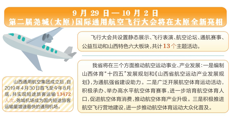 為加大我省通航產業招商引資力度,促進山西通航短途運輸、低空旅游、應急救援、飛行培訓等業務飛速發展,加快航空科技、航空制造、高新技術研發等創新企業落地山西,推動全產業鏈通用航空業加快發展,在成功舉辦第一屆的基礎上,9月29日—10月2日,第二屆堯城(太原)國際通用航空飛行大會將在太原全新亮相。