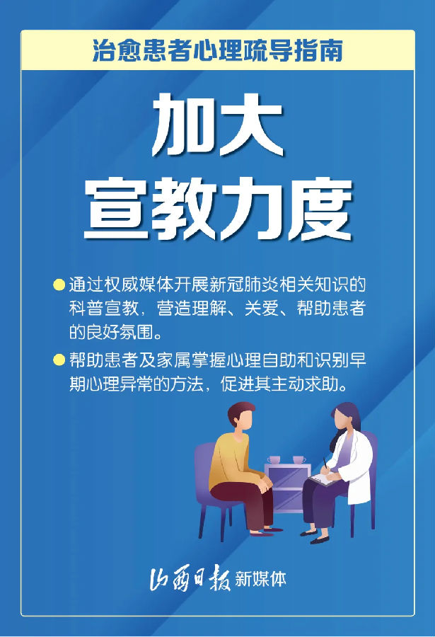 近日,國務院應對新冠肺炎疫情聯防聯控機制綜合組印發《新冠肺炎疫情防控常態化下治愈患者心理疏導工作方案》,以促進治愈患者身心全面康復為目標,從7方面入手,進一步加強治愈患者心理疏導工作。