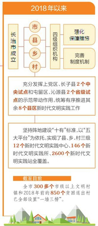 近年來,長治市以“推動移風易俗、樹立文明鄉風”為主題,深入開展新時代文明實踐工作,農村精神文明建設堅持以培育和踐行社會主義核心價值觀為根本,深化鄉村文明建設,努力建設科學規劃布局美、設施完備生活美、村容整潔環境美、服務健全身心美、創業增收致富美、鄉風文明和諧美的文明鄉村。一個個文明村鎮,猶如美麗的畫卷,鑲嵌在青山綠水之間,文明成為長治鄉村最亮麗的風景。