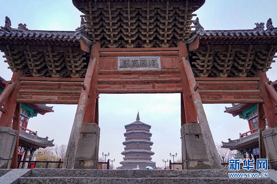 應縣木塔,又稱佛宮寺釋迦塔,位于山西省朔州市應縣城西北佛宮寺內,建于1056年,塔高67.31米,相當于一座20多層高的現代建筑,被列為第一批全國重點文物保護單位。它與法國埃菲爾鐵塔、意大利比薩斜塔并稱“世界三大奇塔”。11月18日,參加第十五屆全國網絡媒體山西行活動的記者編輯走近這座千年古塔,感受中國古代建筑藝術的魅力。新華網 發