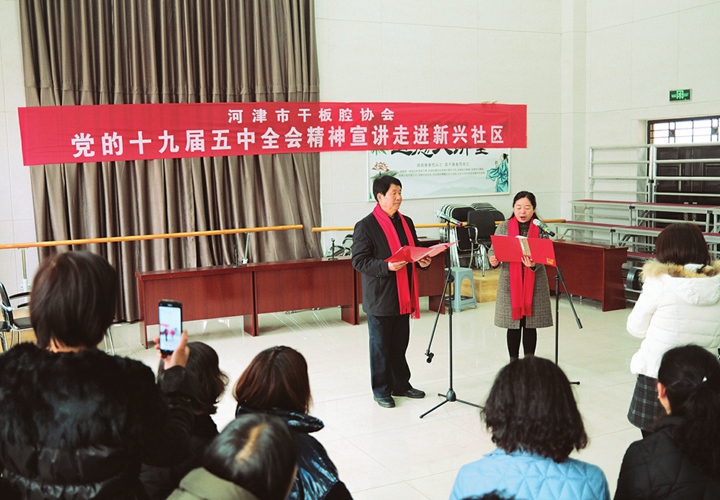 說這么一段干板腔,也就十多分鐘的時間。但是一結束,大家都學會了,有的還能順口說出幾句來,社區居民看得歡樂,也把十九屆五中全會精神學得入腦入心??粗蠹夷敲磹勐?,表演起勁的董朝元更是高興,他籌劃著接下來要走進校園、企業等更多的地方宣講。