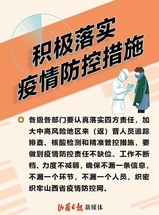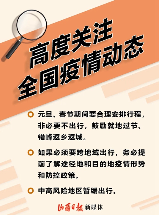 2021年元旦、春節(jié)將至,為科學(xué)精準(zhǔn)果斷做好山西省常態(tài)化疫情防控工作,嚴(yán)格執(zhí)行“外防輸入、內(nèi)防反彈”防控策略,堅(jiān)持“人物同防”“多病共防”原則,嚴(yán)把“境外輸入”“省外輸入”“冷鏈輸入”三個(gè)關(guān)口,確保全省人民度過一個(gè)健康、歡樂、詳和的節(jié)日,省新冠肺炎疫情防控辦再次發(fā)布提示。