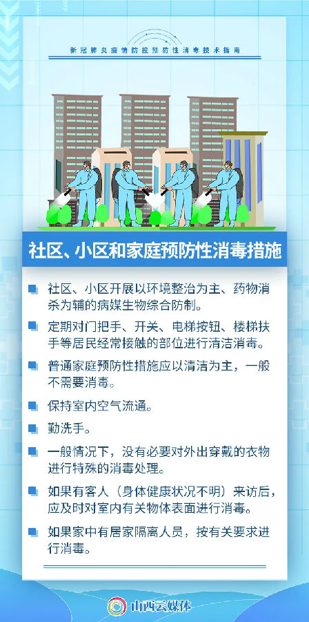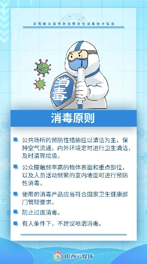 為做好我省新型冠狀病毒肺炎流行期間的預防性消毒工作,指導有關部門和單位開展預防性消毒,近日,省疫情防控辦制定了《山西省新冠肺炎疫情防控預防性消毒技術指南》,對疫情防控預防性消毒做出技術指導。