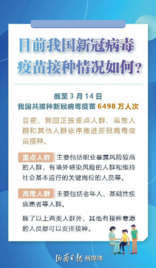 3月15日,國務院聯防聯控機制就推進新冠病毒疫苗接種有關情況舉行發布會。國家衛生健康委副主任李斌介紹,截至3月14日,我國共接種新冠病毒疫苗6498萬人次。那么,疫苗可以自行預約嗎?新冠病毒疫苗安全性又如何?6張海報來解答。