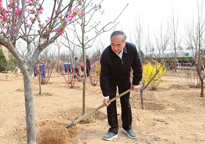 樓陽生來到植樹點,與現場干部群眾、少先隊員一同植樹。他揮鍬鏟土、堆起圍堰、提桶澆水,接連種下金絲槐、榆葉梅、五角楓、金葉復葉槭、紅瑞木、國槐、日本晚櫻、油松等樹苗,既有綠化苗木,又有經濟樹種,為大地增添了點點新綠。樓陽生詢問樹種習性,交流管護經驗,叮囑相關部門,種樹的主要目的是綠化環境,要堅持因地制宜,科學栽植,多栽鄉土樹種,精心做好維護工作,持續提高國土綠化率。和煦的春風中,新栽的樹木迎風挺立,煥發出綠色的希望。樓陽生與一同植樹的少先隊員親切交談,詢問學習生活和勞動鍛煉情況,指導他們認識品種、判斷樹齡,在勞動中增長見識。樓陽生語重心長地說,大家要從小加強鍛煉、熱愛勞動,從小立志,德智體美勞全面發展,親手栽下一棵樹,每年都來看一看,與小樹苗一起長大,將來做對國家、對人民、對社會有用的人。