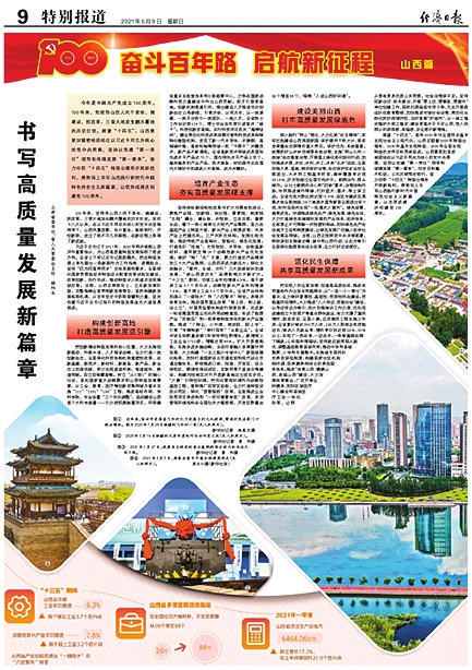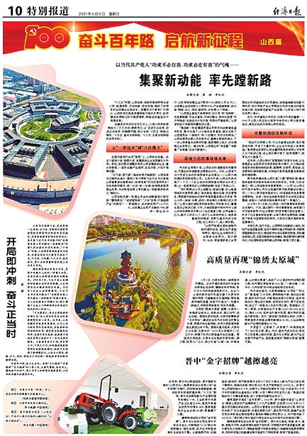 5月9日,《經(jīng)濟(jì)日報》9-12版“奮斗百年路啟航新征程·山西篇”專版報道了山西全省上下牢記習(xí)近平總書記視察山西重要講話重要指示,把在轉(zhuǎn)型發(fā)展上率先蹚出一條新路作為工作指南、邏輯起點(diǎn),堅(jiān)持“四為四高兩同步”總體思路和要求,全面深化國家資源型經(jīng)濟(jì)轉(zhuǎn)型綜合配套改革試驗(yàn)區(qū)建設(shè),改革創(chuàng)新、先行先試,推動轉(zhuǎn)型步入軌道并呈現(xiàn)強(qiáng)勁態(tài)勢。