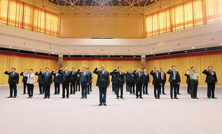 6月29日上午,參觀“不忘初心、牢記使命——山西省慶祝中國共產黨成立100周年圖片展”結束后,省委書記、省人大常委會主任林武帶領黨員領導同志重溫入黨誓詞。記者李聯軍攝