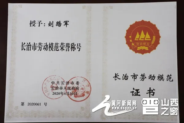 圖為:劉路軍獲得的“長治市勞動模范”證書