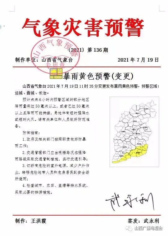 山西省氣象臺2021年7月19日11時35分變更發布暴雨黃色預警,預警區域:運城、晉城、長治。預計未來6小時內預警區域的部分地區降雨量將達50毫米以上,或者已達50毫米以上且降雨可能持續,局地伴有短時強降水或短時大風。請有關單位和人員做好防范準備。