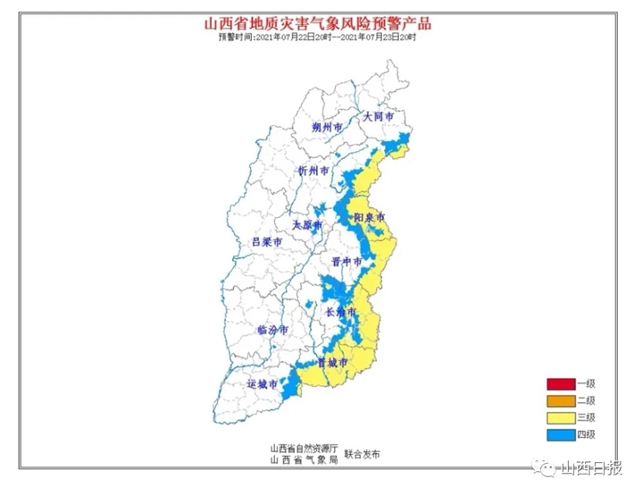 山西日報記者張麗媛報道 山西省自然資源廳和山西省氣象局2021年7月22日17時40分聯合發布地質災害氣象風險預警。