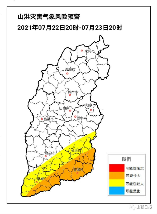 預計,2021年7月22日20時至7月23日20時,強降雨可致運城西部、臨汾東南部、長治中部發生山洪的可能性較大(黃色預警),運城東部、晉城、長治東南部發生山洪的可能性大(橙色預警)。請上述地區有關單位和部門做好實時監測、防汛預警和轉移避險等工作;廣大群眾安排好生產生活,遠離邊山峪口,避開山洪溝道,注意防范洪水威脅。