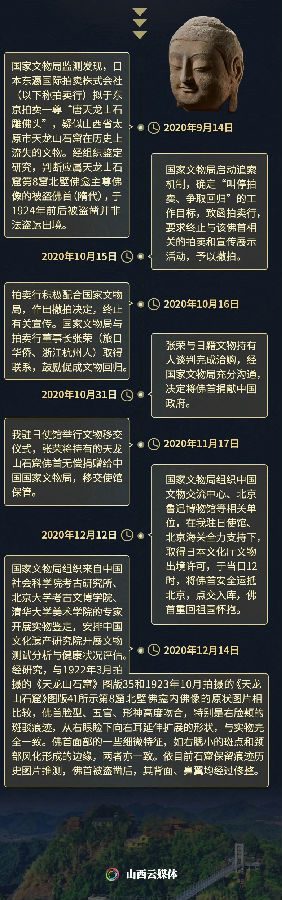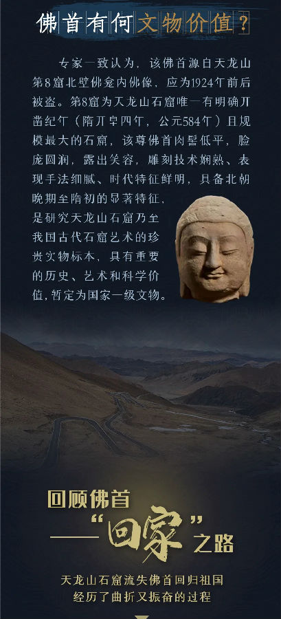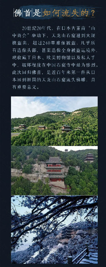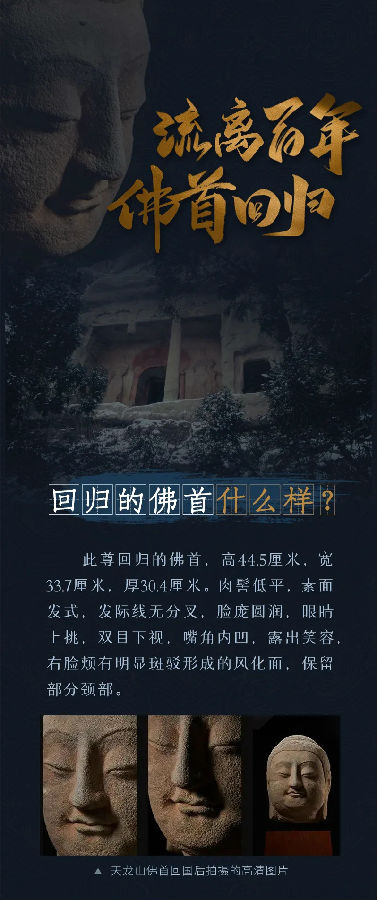 7月24日上午,天龍山石窟“第8窟北壁主尊佛首”正式回歸原屬地,亮相當(dāng)日在太原市天龍山石窟博物館開(kāi)幕的“復(fù)興路上 國(guó)寶歸來(lái)”特展,并在此長(zhǎng)期陳列展出。它成為近百年來(lái)第一件從日本回歸天龍山石窟的珍貴流失文物。