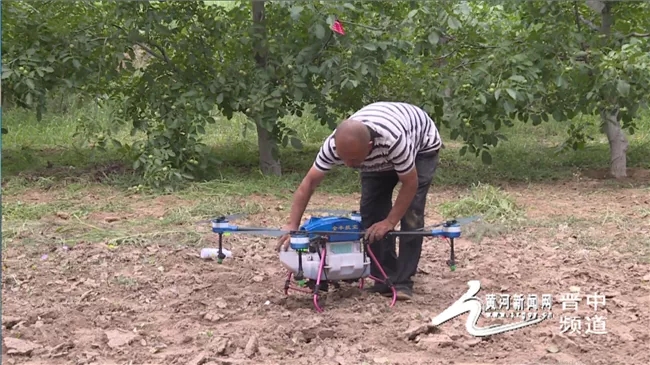 近日,在王禹鄉洪土村的核桃經濟林示范園內,核桃技術服務隊的隊員們忙著鋤草、施肥和打藥,同時,他們操作的無人機也在核桃林上空噴灑農藥,確保核桃樹病蟲害防治全覆蓋。