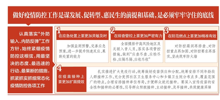 林武在講話中指出,做好疫情防控工作是謀發展、促轉型、惠民生的前提和基礎,是必須牢牢守住的底線。要深入貫徹黨中央及省委決策部署,認真落實“外防輸入、內防反彈”工作方針,始終緊繃疫情防控這根弦,用最堅決的態度、最迅速的行動、最果斷的措施,抓緊抓實抓細常態化疫情防控各項工作。一是在應急處置上要更加靈敏及時。加強監測預警,完善應急預案,進一步提升快速反應、果斷處置的能力。立足更精準更有效地防,做好發熱門診信息登記和預檢篩查,精準開展防控研判,做到早發現、早報告。深入開展疫情防控培訓和應急指揮、聯合處置演練,做好應對突發情況的各項工作準備,強化督促指導,確保第一時間反應,第一時間決策,第一時間處置,牢牢掌握防控主動權。二是在排查管控上要更加嚴密有力。全面摸排中高風險地區及關聯入晉人員,落實各項管控措施,做到“應查盡查、應檢盡檢、應隔盡隔、應收盡收”。強化屬地“第一落點”管控責任,關口前移,管控前置,實施有效的動態排查,織密織牢管控體系。三是在防范燃點上要更加精準有效。對防控漏洞再排查、對防控重點再加固、對防控要求再落實,堅決筑牢防火墻。要周密做好國際航班經停太原入境防控、進口冷鏈物流管理、醫療機構院感防控、隔離酒店管理等工作,確保各項工作措施環環緊扣、精準有效、不出紕漏。要以更嚴格的管理強化校園安全防控,繼續做好景區、餐飲、文化娛樂等人員流動性大的場所,養老、救助、兒童福利機構等重點部位的疫情防控工作,嚴防輸入性、聚集性、關聯性感染風險。要對入境人員加強管理,設置專用通道,縮短登記轉運時間,減少人員聚集交叉感染風險。對醫務人員、隔離場所、交通場站一線工作人員等,要持續強化個人防控、健康監測、閉環管理等措施。四是在疫苗接種上要更加擴面提效。扎實推進擴大免疫行動,統籌做好疫苗供應和分配,統籌安排不同年齡段人群接種工作,充分發揮社區衛生服務中心和鄉鎮衛生院分布點多、覆蓋范圍廣的特點,合理安排接種單位布局,方便群眾就近接種。要深入宣傳疫苗的安全性和接種的必要性,引導群眾積極接種、主動接種、及早接種,共筑健康屏障。